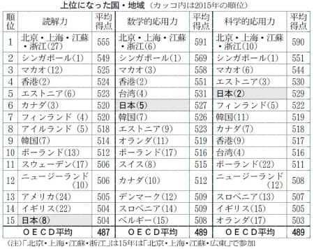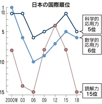 03年調査では日本の順位や平均得点が下がって「PISAショック」と呼ばれ、文部科学省が「脱ゆとり教育」の路線を本格化させた。特にトップレベルにあった読解力が14位と急落。12年調査は4位に回復したが、15年調査で8位に下がっていた。