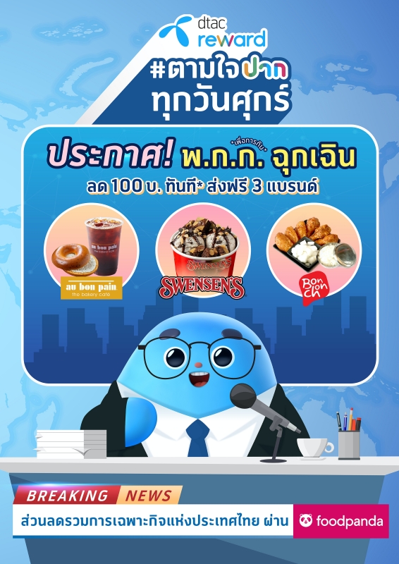 ดีแทค รีวอร์ด จัดแคมเปญ #ตามใจปากทุกวันศุกร์ ประจำเดือนมิถุนายน เน้นจับมือพันธมิตร Food delivery ต่อเนื่อง จากการตอบรับของลูกค้าดีแทคที่เข้ามาใช้สิทธิพิเศษมากขึ้น โดยมีการเติบโตในการร่วมรับสิทธิเพิ่มขึ้นถึง 5 เท่า ในช่วงล็อคดาวน์ที่ผ่านมา ล่าสุดร่วมกับพันธมิตร 3 ร้านดัง SWENSEN’S , au bon pain และ Bonchon ลด 100 บาท ทุกเมนู เมื่อสั่งผ่าน foodpanda ทุกวันศุกร์ที่ 5,12,19 และ 26 มิถุนายน 2563 มอบสิทธิพิเศษสำหรับลูกค้าดีแทคระบบเติมเงินและรายเดือน ที่มีสถานะ PLATINUM BLUE MEMBER, GOLD MEMBER และ SILVER MEMBER (เช็กสถานะดีแทค รีวอร์ด กด *140# โทรออก (ฟรี) หรือ ผ่านทาง dtac app)